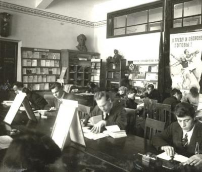 Рис. 5. Читальный зал Новосибирской областной библиотеки, 1940-е годы [23]