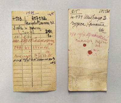Рис. 6. Библиотечные формуляры с автографами И. И. Соллертинского и Е. А. Мравинского [23]