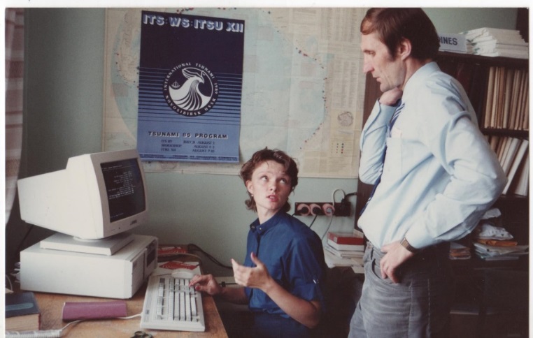 Создавалась проектная группа, когда из нескольких лабораторий брали людей с теми компетенциями, которые были нужны в данном исследовании. У нас были инженеры, математики (я как математик выступала), геофизик и программисты, стажер-исследователь Василий Титов. Марчук Андрей Гурьевич, математик нашей проектной группы, вёл основной проект по матмоделированию. Из Красноярска во всём этом участвовал Чубаров Леонид Борисович. Их Институт вычислительных технологий потом только переехал в Новосибирск. И до сих пор Гусяков, Марчук и Чубаров продолжают работать над этим. Вячеслав Константинович Гусяков – это лаборатория матмоделирования, он потом у меня тоже был научным руководителем. И ещё с той конференции по цунами стали работать уже плотно… Гусяков, Марчук, Чубаров.