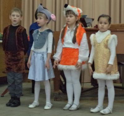 Для того чтобы детям было легче воспринимать материал, на начальном этапе можно использовать уже знакомые им сюжеты сказок в новом информационном контексте. Так, при знакомстве ребят подготовительной группы с интервалами, я взяла русскую народную сказку «Теремок», где роль зверей заняли музыкальные интервалы. После предварительного знакомства с интервалами, мы побеседовали с детьми, как соотносится величина и характер звучания интервала с характерами персонажей сказки и затем вместе выбрали наиболее подходящие сочетания. А затем подготовили и представили на концерте соответствующую театрализацию.