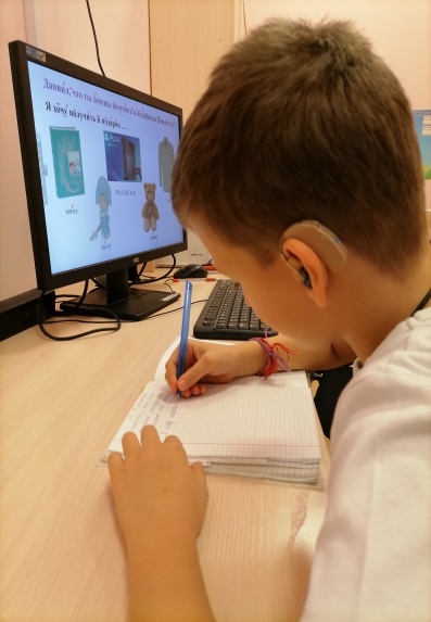 На втором этапе проводилась работа с детьми на индивидуальных занятиях по развитию восприятия и воспроизведению устной речи. Задачей учителя было помочь выбрать желаемый подарок из ряда предложенных. Маленькая хитрость: в ряде предложенных подарков были те, которые уж точно не понравятся конкретному ребенку, например, мальчик не захочет в подарок куклу. Среди этих подарков ребята быстро узнавали тот, который накануне обговорили с родителями. После этого каждый написал письмо Деду Морозу, в котором рассказал немного о себе и описал свое желание. ло