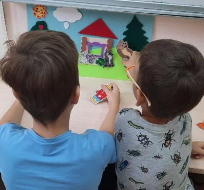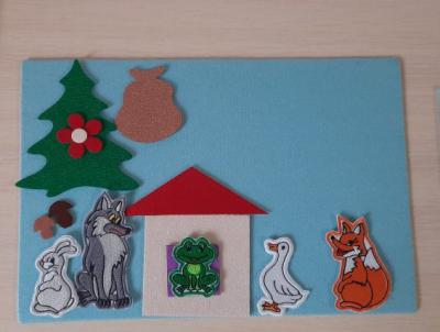 Элементы театрализации удобней всего применяются в индивидуальной работе или работе малыми подгруппами из 3-4 человек. Дети выбирают героев сказки, и начинается их постепенное перевоплощение в артистов. Передвигая фигурку по фланевеграфу, ребенок вживается в персонажа, переходя от прослушивания сказки к озвучиванию монолога и диалога героев. Дети учатся использовать интонацию, высоту голоса, ведь волк и медведь не могут говорить голосом испуганного лягушонка.