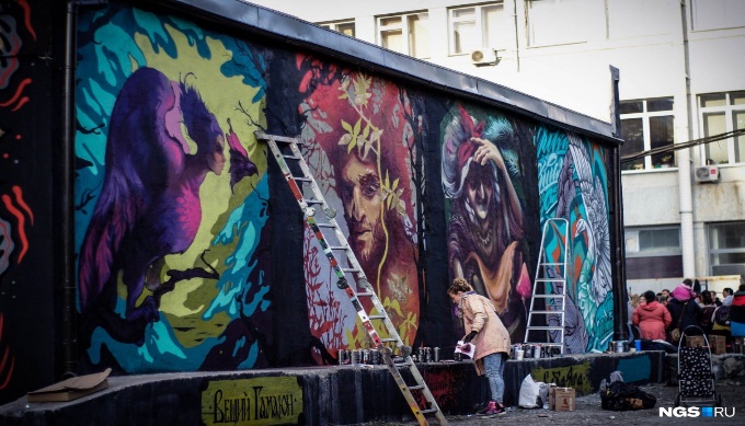 В 2017 г. граффити из Первомайского сквера переехало в другое место, а на стене трансформаторной будки появились новые арты, теперь уже на тему нашей национальной идентичности – персонажи русских народных сказок и сказочные символы. В этот раз участникам арт-группы уличных художников «Такнадо!» (Марина Calipso – художник-монументалист, Иван Ягода и Иван Fans – студенты Архитектурно-художественной академии, Миша Mack – мастер tatoo) пришла идея создать что-то общее, коллективное, что стало бы родным каждому из жителей Новосибирска. Так на одной стене появились портреты Бабы-Яги, Гамаюна, Лешего и Царевны-Лебедь, а на другой – шишки, сундуки, избушка, рыбка и другие элементы сказок, написанные хохломой (фото 4–5).