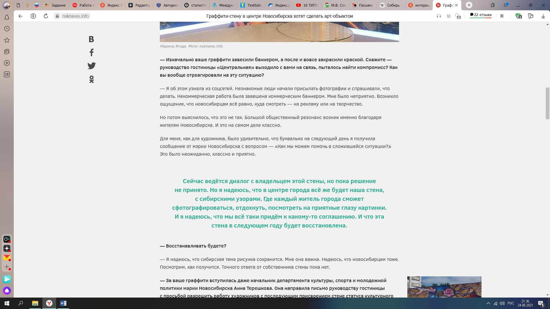 Фото 7. Отрывок из интервью художницы Марины Ягоды изданию nsknews.info