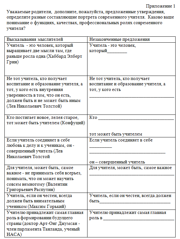 Опрос по методике «Незаконченные предложения» (см. Приложение 1) показал, какими видят современного педагога и школу родители моего класса. Педагог должен любить детей, т.к. без любви, без принятия ребёнка таким, какой он есть невозможно работать с детьми.