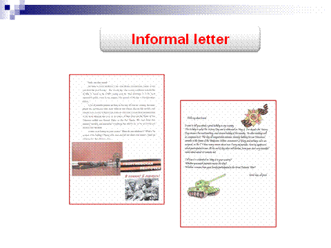 В данном формате мы отрабатываем навыки написания неофициального письма, пишем о традициях празднования Дня Победы в нашей стране, о том, как проходит Бессмертный полк у нас в стране, в городе и в нашей гимназии.