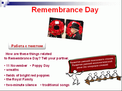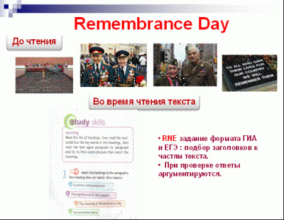 Подробнее представлю урок «День Победы» (“Remembrance Day”) и приведу ключевые этапы работы с текстом на уроке: до чтения, во время чтения и после чтения текста.