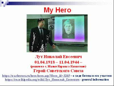 На слайде Волков Андрей, учащийся 10 «А» класса, рассказывает о своем прадедушке Лут Николае Евсеевиче, который в июне 1941 года был призван в Красную Армию, был помощником командира взвода 218 гвардейского стрелкового полка, Герой битвы за Днепр: из потонувшей лодки первым выбрался на берег, открыл огонь и повёл за собой солдат…