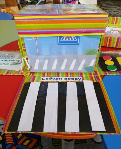 Описание: Детям предлагается собрать «Зебру» (пешеходный переход) из заготовок – большие прямоугольные полоски белого цвета нужно разместить на черной большой панели при помощи липучек. Упражнение сначала выполняется по образцу, затем по памяти.