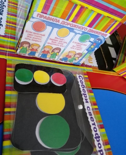 Описание: Детям предлагается собрать светофор из заготовок – прямоугольника черного цвета и кругов трех цветов на липучках (красный, жёлтый, зелёный). Упражнение сначала выполняется по образцу, затем по памяти.