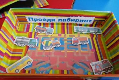 Материалы: готовое поле с изображением лабиринта, машины разных видов.