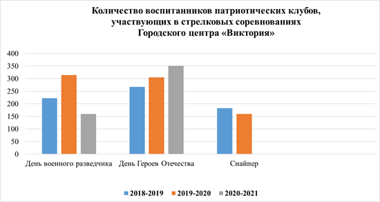 Воспитанники патриотических клубов и объединений активно принимают участие во всех мероприятиях, которые проводит отдел патриотического воспитания Городского центра «Виктория». Если сравнивать 2020-2021 учебный год с прошедшим 2019-2020, исключая соревнования, которые не состоялись по причине отмены всех городских массовых мероприятий из-за карантина – количество участников возросло на 5,72%.