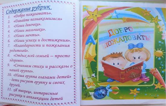 Итак, первая, вводная рубрика нашего портфолио – «Добро пожаловать!». Она содержит общую информацию, представляющую группу, название, рисунки или фотографии тематических уголков, возраст детей, рассказ о педагогах.