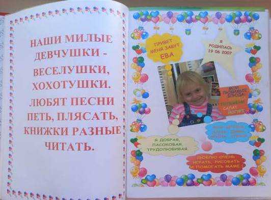Третья рубрика: «Наши девочки» и «Наши мальчики» содержит отдельные описания девочек и мальчиков группы. Указываются их имена, увлечения, любимые игрушки, занятия и др.