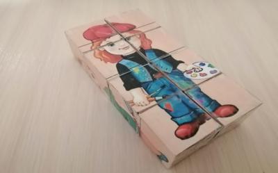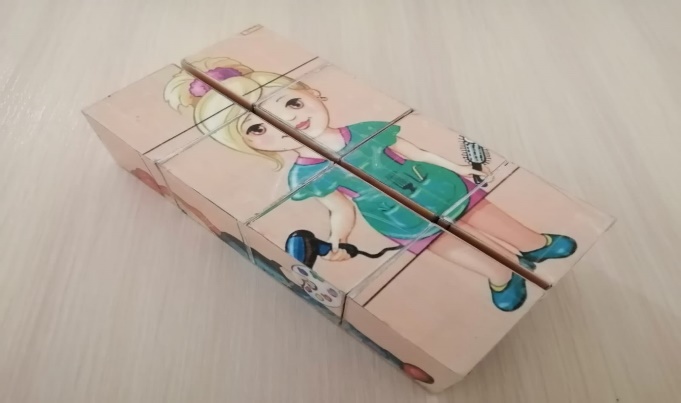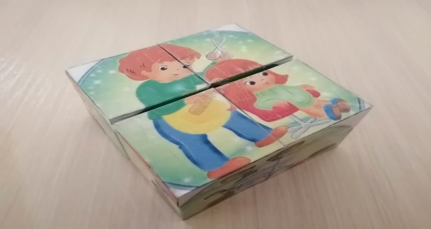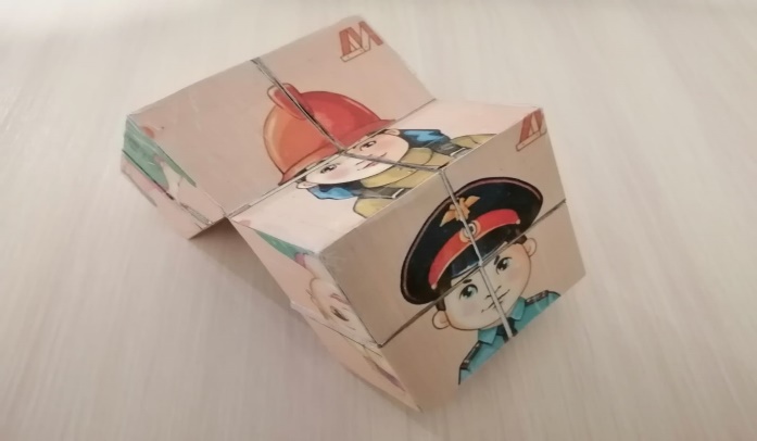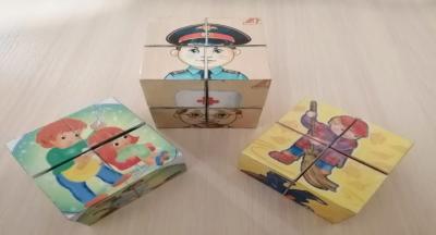 Третий комплект кубиков-трансформеров имеет размеры 8см*8см*8см, состоит из двенадцати кубиков размерами 4см*4см*4см, которые соединены между собой горизонтально и вертикально клейкой лентой. По уровню сложности – повышенный (высокий). При раскладывании кубиков в разные стороны получаются картинки с изображениями профессий. На поверхность кубиков я также распечатала и наклеила на клей-карандаш цветные картинки с изображениями профессий, которые разделила на четыре одинаковые части по размерам кубиков – 4см*4см, сверху закрепила скотчем. Поверхность кубиков получилась такой же гладкой, цветной, яркой, приятной на ощупь. На маленьких кубиках изображены девять профессий – это такие профессии, как врач, художник, повар, моряк, учитель, парикмахер, строитель, полицейский, пожарный. Такой комплект кубиков подходит для среднего, старшего и подготовительного возрастов. В данном комплекте дети уже обобщают и закрепляют полученные знания о профессиях. Это позволяет дошкольникам быть самостоятельными, примерять на себя роль той или иной профессии в игровой деятельности, относиться доброжелательно к сверстникам и взрослым, к окружающему миру и самому себе, уважать себя и труд взрослых. С педагогической точки зрения помогает формировать детскую инициативу, развивает у ребенка чувство собственного достоинства, позволяет общаться и играть со сверстниками, делиться своими знаниями, навыками и умениями в той или иной игре, участвовать в совместной деятельности со взрослыми, учиться договариваться, уважать чувства других, поддерживать в проигрыше и радоваться успеху.