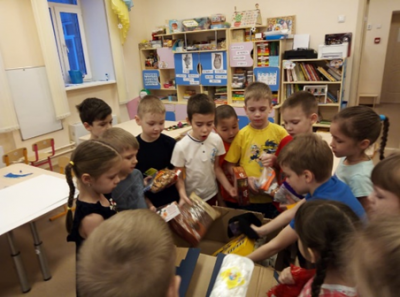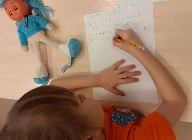 Также в течение недели проходили тематические мероприятия патриотического характера с участием родителей. Мы проводили беседы о защитниках Отечества, приглашали пап для рассказа о том, как они проходили службу, читали произведения художественной литературы о солдатах, армии, знакомили с разными родами войск, загадывали загадки о военной технике. А ребята вместе с родителями собирали в посылку сладости, канцелярские принадлежности, зубную пасту, теплые носки и т.д. Дети с восторгом и огромным желанием готовили посылку солдатам, понимая, что тем самым они поднимут боевой дух и настроение военнослужащих. В группе все вместе с большим уважением сочиняли и писали письмо сами дети. «Здравствуйте! Дети группы «Дюймовочка» поздравляют вас с праздником! Желаем вам здоровья и хорошо служить.» Посылка получилась большая и очень тяжелая. Ребята испытали гордость от совершенного доброго дела, а как приятно солдату, который находится вдали от родного дома, получив посылку от детей, вспомнить свое детство. Это напомнит ему еще раз, что его помнят и ждут дома.