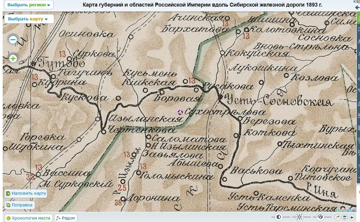 Деревня Сухострелова на карте губерний и областей Российской империи вдоль Сибирской железной дороги 1893 г. (по материалам сайта etomesto.ru) |