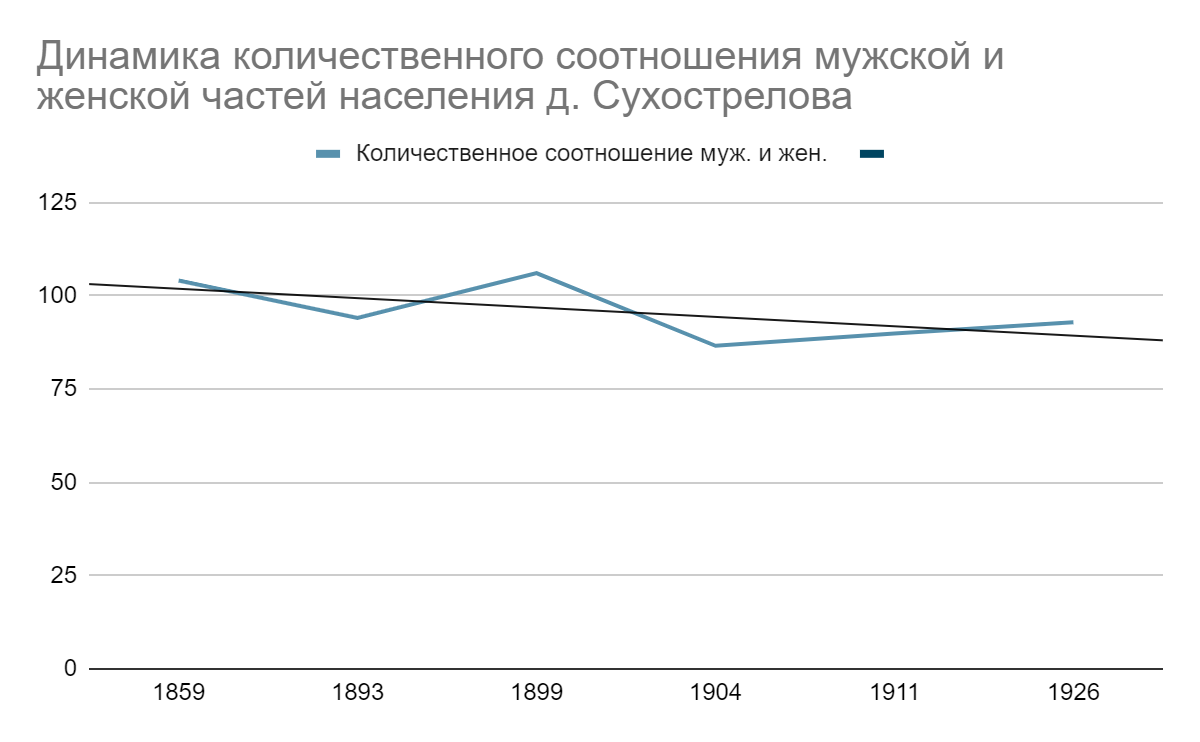 На следующем рисунке в виде графической диаграммы представлена динамика количественного соотношения мужчин и женщин в деревне. Из нее мы видим, что в Сухостреловой в обозначенный период наблюдалась тенденция к уменьшению доли мужского населения. Лишь в 1859 и 1899 гг. проявляется преобладание мужчин. Также мы видим резкое снижение доли мужского населения в период с 1899 по 1904 г.