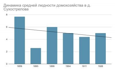 На следующей диаграмме отображено изменение средней людности деревенского двора в Сухостреловой. В изучаемый период наблюдалась тенденция к уменьшению средней людности. Сильное падение произошло между 1859 и 1893 гг. Можно сделать предположение, что этот разрыв был связан с эпидемиями начала 90-х гг. XIX в. К 1899 г. средняя людность двора приблизилась к прежним показателям, чтобы затем понижаться более постепенно.