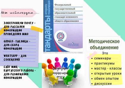 В работе, представленной далее, фактически представлена система работы ММО (проведение заседаний ММО, сбор актуальной информации, хранение информации, создание совместных электронных продуктов, размещении информации на сайте муниципального образования) с использованием разнообразных ресурсов: