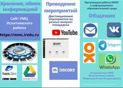 Обсуждая и иллюстрируя проведение муниципальных методических объединений в офлайн-формате, стоит отметить и онлайн-форматы, а также использование информационно-коммуникационных технологий и инструментов в деятельности руководителей ММО. За последние два года произошел значительный рост уровня информационно-коммуникационной компетентности педагогов. Руководители ММО имеют возможность опираться как на свой собственный наработанный педагогический опыт, так и на тот опыт, который они получили, обучаясь по дополнительной программе повышения квалификации для руководителей ММО на кафедре начального образования ГАУ ДПО НСО НИПКиПРО «Методические аспекты деятельности муниципального методического объединения учителей начальных классов». Дистанционная часть программы организована в СДО Moodle, где помимо стандартных возможностей платформы были задействованы инструменты внешних ресурсов. Среди них приложения Google Диска с подключением удаленного доступа к созданию совместных продуктов, онлайн-доски для организации обсуждений общих тем, видеоконференции, сервис визуализаций Canva и т.д. Задачу освоения или продолжения работы с этими инструментами для выполнения заданий авторы программы пролонгировали в проекции использования новых возможностей в деятельности руководителей ММО. Одним из результатов стало создание буклетов в сервисе Canva о тех инструментах, которые педагоги используют для более продуктивной работы с коллегами в своем муниципальном методическом объединении. В качестве иллюстраций приведены несколько таких работ: