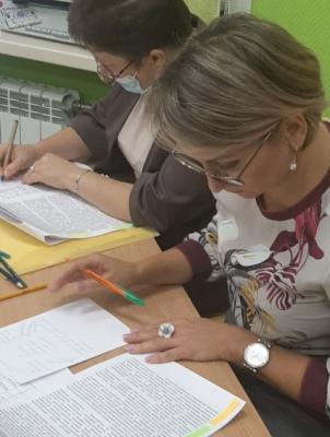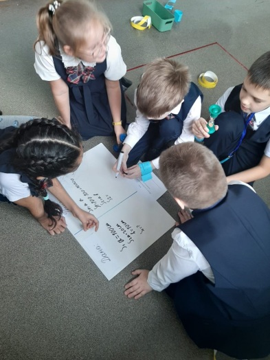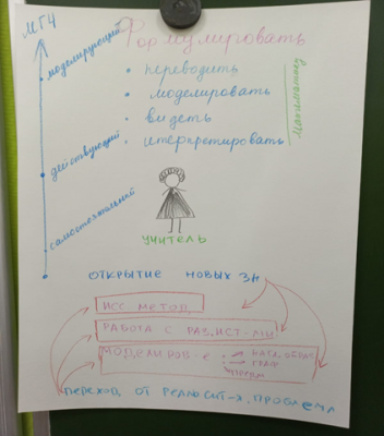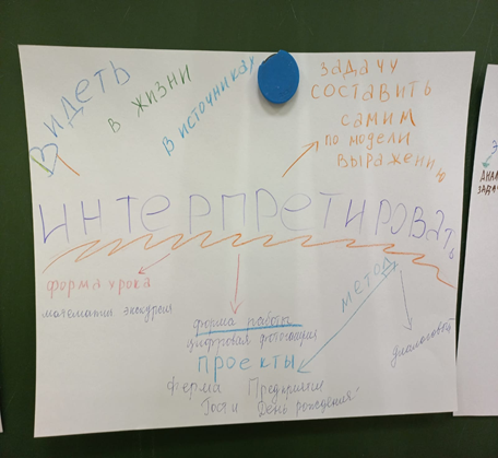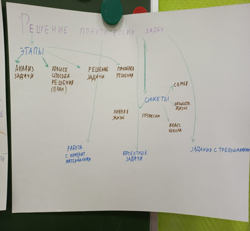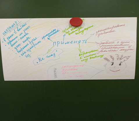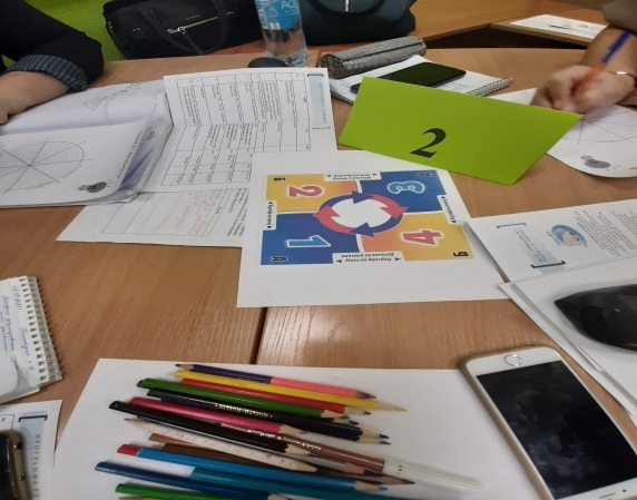 В первой части семинара учителя разделились на группы по цвету и работали со своим фрагментом текста статьи «Методика формирования математической грамотности» в группах. Затем учителя переместились в другие группы под номерами, соответствующими номеру части статьи, в которых обсуждали то, как они могут понятно объяснить, помочь запомнить и изобразить на ватмане основное содержание своей части статьи по методике формирования математической грамотности. Вернувшись в «родные» группы, познакомили ее членов со своим контентом и рассказали всем.