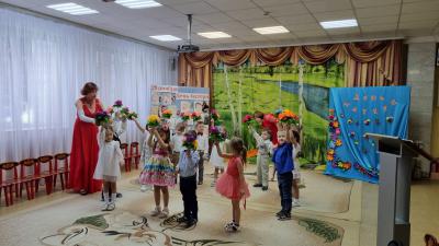 А сейчас, дети под веселую музыку будут собирать по три цветка в букет маме.