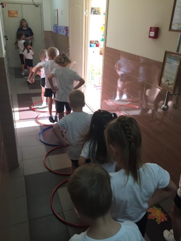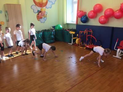 Инструктор: Впереди большие ямы, перепрыгнем через них. Листочки указывают, куда нам идти дальше.