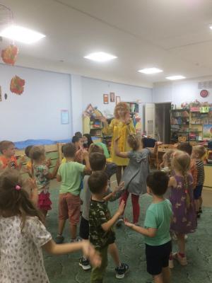 Солнышко: Ох, спасибо вам, ребята, настроение мое повысилось, я снова улыбаюсь и ярко свечу! Давайте вместе поздравим наших именинников, пожелаем им расти счастливыми и здоровыми! Предлагаю исполнить для них хороводный танец «Каравай»!