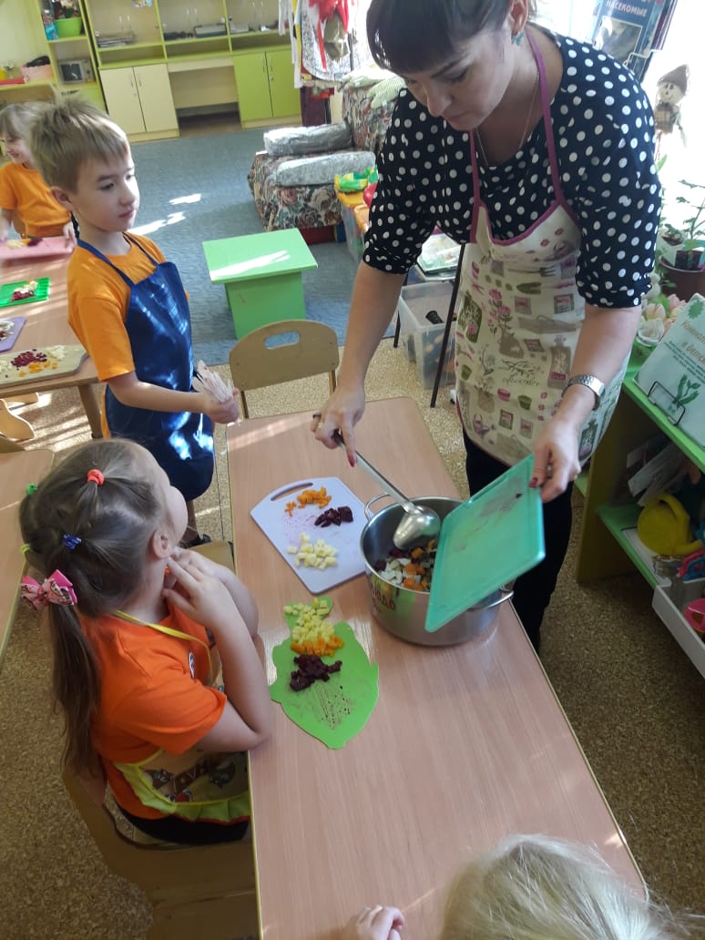 Оборудование: Овощи варёные (картошка, свёкла, морковь), консервированный горошек и квашенная капуста, разделочные доски, фартуки, пластмассовые ножи по количеству детей, салфетки, подсолнечное масло, соль, большая кастрюля, салатница, тарелочки по количеству детей.