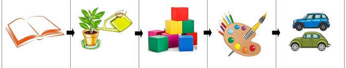 Бывают ситуации, когда во время свободной самостоятельной деятельности ребенок не знает, чем заняться, тогда ему можно предложить выбрать карточку, где засхематизированы различные виды деятельности. Читая карточку и выполняя последовательно задания, ребенок вовлекает себя в игровую деятельность: