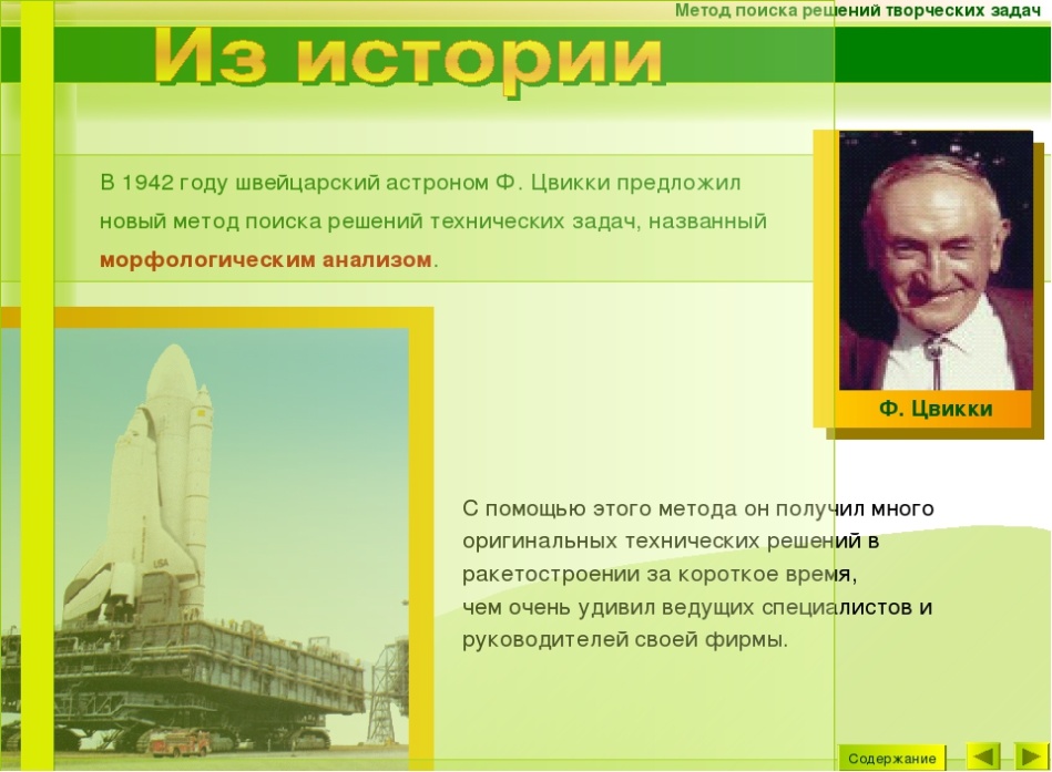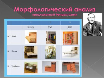 Он его использовал в ракетостроении и смог за короткое время получить большое количество оригинальных технических решений. Суть метода в том, что мыслительные операции основаны на комбинировании и осуществляются с помощью таблицы, которую называют «морфотаблица» или «матрица». В этой таблице по вертикали и горизонтали выставляются какие-либо показатели. Пересечение значений этих показателей и является основой аналитической деятельности.