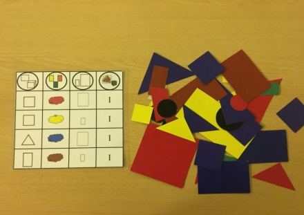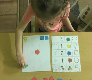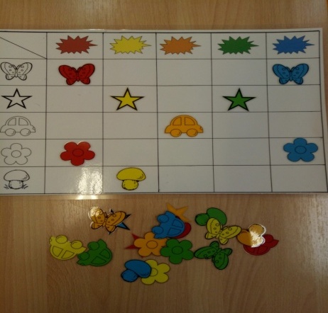 Анализируя признаки объекта (цвет, форму), ребенок заполняет ячейки таблицы.