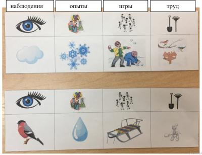 Собираясь на прогулку, можно предложить детям карточки-схемы, отражающие структуру прогулки. Дети получают возможность самостоятельно выбрать объект наблюдения, исследовательскую деятельность, игры.