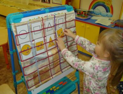 Постепенно работа усложняется, вводятся новые показатели, увеличивается их количество. Так, например, во второй младшей группе детям можно предложить игру «Заполни поле»: