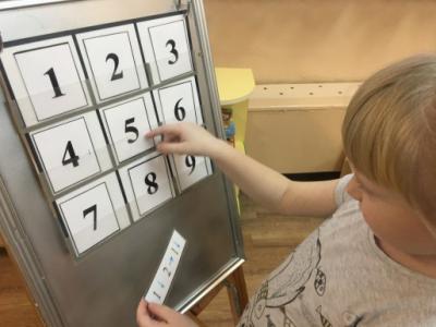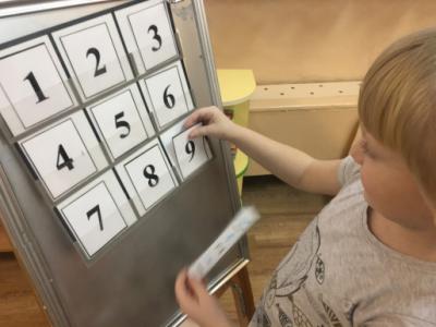 Это дает возможность ребенку не только вспомнить правила игры, но и проанализировать порядок действий и спрогнозировать предполагаемый результат. Такую работу с матрицами и схематическими картами мы используем во всех режимных моментах. Так, например, использование «математической матрицы» помогает мне при организации образовательной деятельности: я раздаю детям полоски, на которых закодировано число. Выполняя определенные шаги по таблице, ребенок находит ячейку с нужной цифрой – это будет или номер стульчика, на котором он будет сидеть, или (если это занятие в Монтессори-классе) номер коробочки, с которой он будет заниматься: