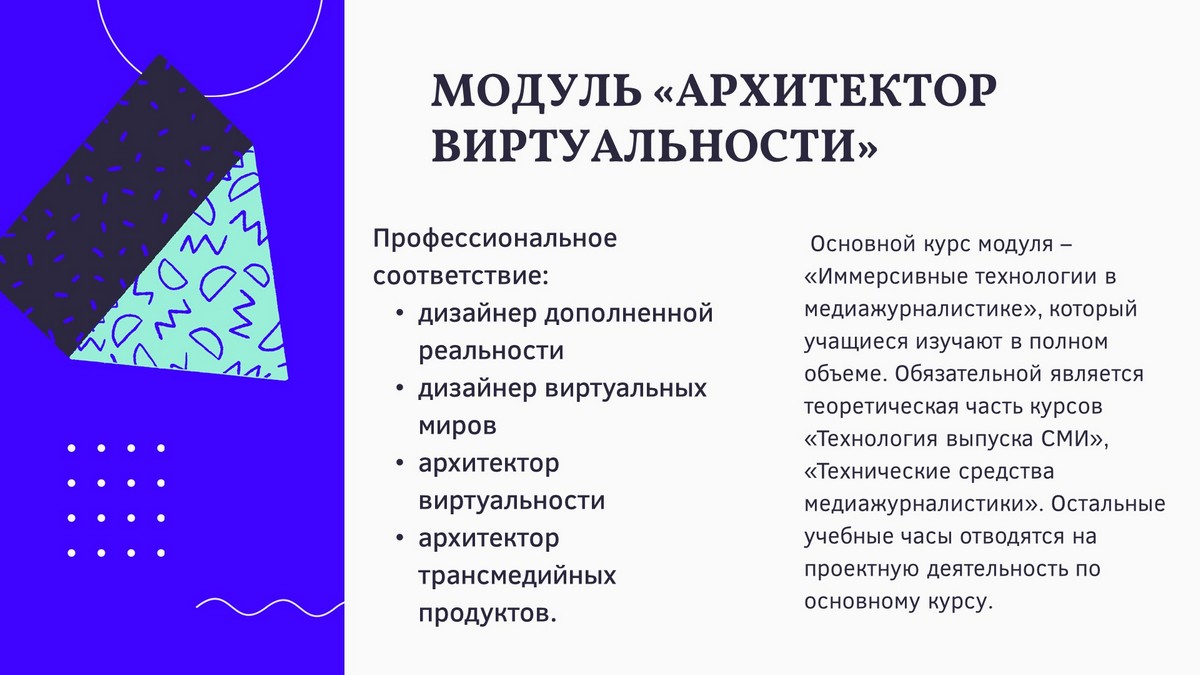 Основной курс модуля – «Иммерсивные технологии в медиажурналистике», который учащиеся изучают в полном объеме. Обязательной является теоретическая часть курсов «Технология выпуска СМИ», «Технические средства медиажурналистики». Остальные учебные часы отводятся на проектную деятельность по основному курсу.