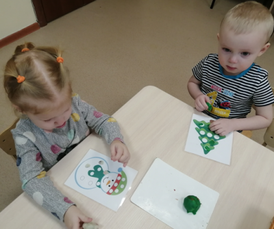 После освоения основных приемов лепки детьми и умения работать по многоразовому шаблону, во втором полугодии учебного года можно усложнить упражнения. Детям предлагаются готовые шаблоны из плотного картона (варежка, сапожок, новогодняя игрушка, елочка и др.) для украшения приемом придавливания разноцветными пластилиновыми шариками, жгутиками, горошинами по выбору детей. Ребята проявляют аккуратность при работе с пластилином, работу выполняют последовательно и доводят начатое дело до конца. Рисунок получается объемным и живым, что очень нравится малышам.