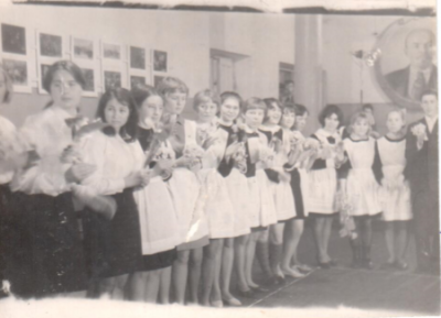 Мы маленько подросли, и нас во втором классе приняли в октябрята. И нам объясняли: галстук – это пионеры, а вот со звёздочками – это октябрята. Это было очень торжественно! Все оделись в белые фартучки, мальчики рубашки одели, и нас принимали в октябрята. Но в октябрята принимали несколько классов. Вот в этот большой коридор, он был буквой П, выстраивали каждый класс в шеренги. И пионеры пришли в зал со знаменем дружины, барабаном, горном. Пионеры пришли тоже нарядные – в галстуках. Всё было торжественно, как праздник. Для этого праздника нас учитель и пионеры подготовили. Рассказали, кто такие октябрята – дружные ребята, что они помогают друг другу, что они не обижают младших, живут дружно. Это были самые простые правила: октябрята книжки не рвут, тетрадки не рвут, хорошо учатся, не обманывают, родителям помогают – вот такие какие-то были совсем простые правила. Нас приняли в октябрята и прикололи маленькие красные звёздочки на школьную форму.