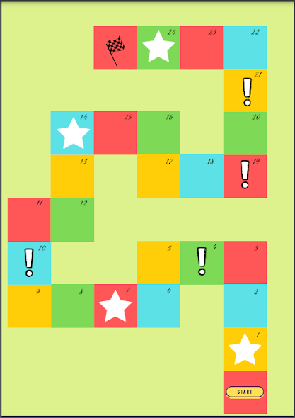 Игровое поле представляет собой цветные квадраты с нанесёнными на них цифрами, обозначающими номер игровой карточки [Рисунок 1]. На некоторых квадратах игрового поля встречаются символы: «!» указывает на необходимость словесного описания эмоции на карточке с соответствующим номером, участнику необходимо передать название эмоции на карточке с соответствующим номером с помощью мимики.