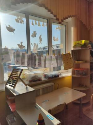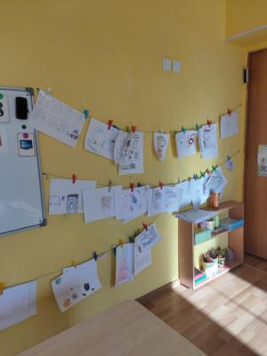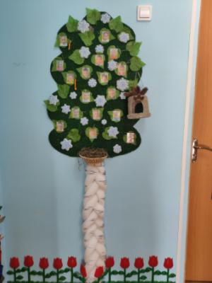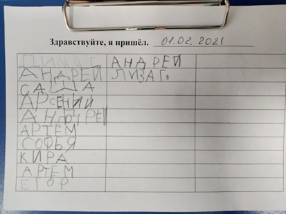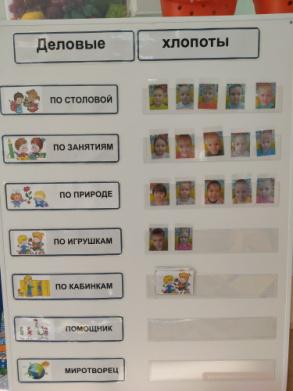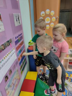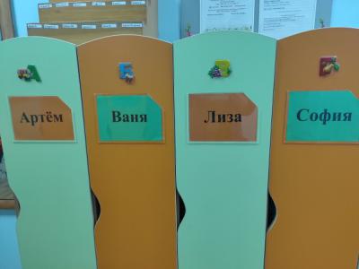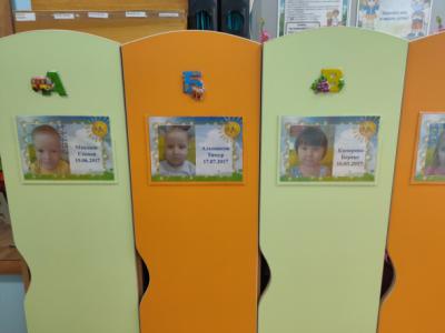 В среде группы представлены имена детей и их фотографии повсюду (кабинки, кроватки, столы, стулья, рисунки, коробочки с секретиками и т.д.)