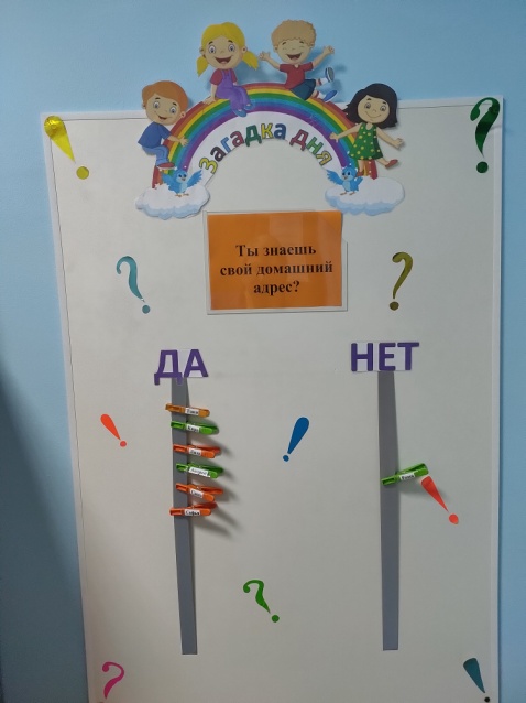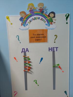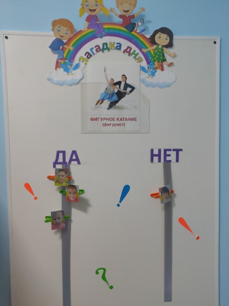 «Загадка дня». Когда дети утром приходят в группу, воспитатель здоровается с ними и предлагает загадку, представленную на специальном стенде, на которую каждый ребенок должен дать ответ. Загадки и ответы детей обсуждаются группой во время утреннего сбора (утреннего круга).