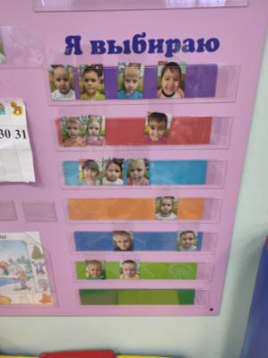 Экран выбора, с помощью которого дети обозначают свой выбор, выбранный центр активности и вид деятельности. Каждый центр в группе обозначается определенным цветом, ребенок на экране ставит свою фотографию, и воспитатель наглядно видит, какой вид деятельности предпочитает каждый ребенок.