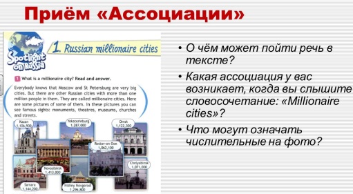 Один из приемов – «Ассоциации». Обучающимся предлагается прочитать заголовок текста и ответить на вопросы: О чём может пойти речь в тексте? Какая ассоциация у вас возникает, когда вы слышите словосочетание...? Из какого источника могла быть взята эта информация?