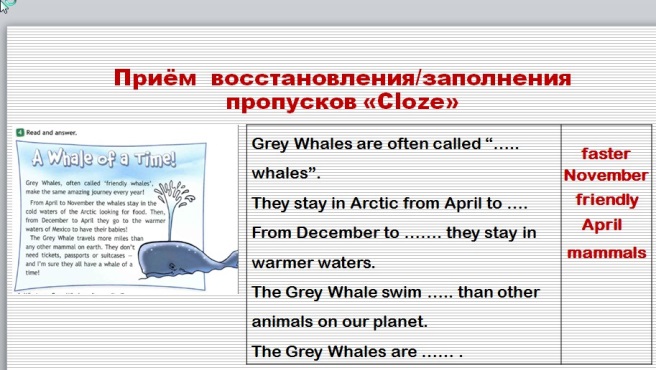 Приём восстановления/заполнения пропусков «Cloze» используется для работы со связным текстом, в котором преднамеренно пропущены некоторые слова или информация. Задача учащихся восстановить деформированный текст и подобрать пропущенные по смыслу слова исходя из контекста. Этот прием может быть использован только для развития умения чтения с полным пониманием информации, т.к. заполнение пропусков невозможно без понимания всех перечисленных в тексте деталей.