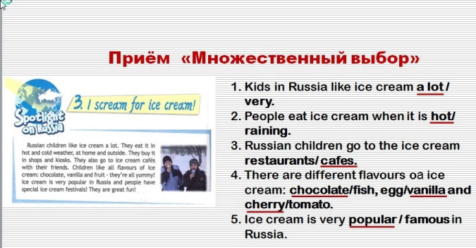 Прием «Множественный выбор» направлен на то, что учащиеся выбирают правильную информацию.
