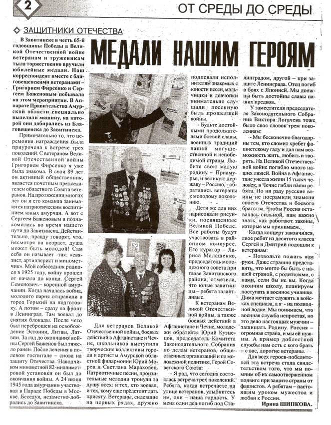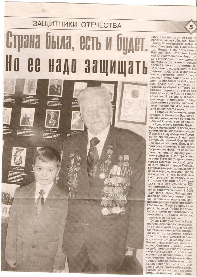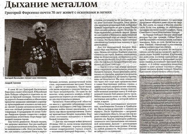 …Григорий Васильевич всегда был активным, такая непоседа. Трижды учувствовал в Парадах Победы в г. Москве (1995, 2000, 2005 гг.). Обязательно посещал могилу дорогого батяни-комбата, героя Советского Союза Константина Гонтаря и привлекал внимание полиции в аэропорту. Артиллерийские осколки в легких всегда «звенели» в рамке металлоискателя. Это вторая память о разведке боем в окрестностях Мурманска.
