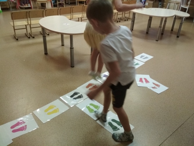 Для развития крупной моторики детей мы сделали напольные «Классики» и «Цветные следы». Играя в «Классики», дети тренируются в счете, сами придумывают несложные варианты игры. «Цветные следы» также можно использоваться по-разному. Изучать направление, счет, чередовать цвет.