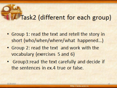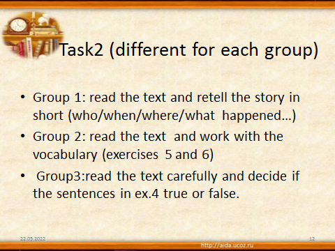 На следующем этапе обучающиеся должны были выполнять дифференцированные задания. Еще до начала урока я попросила их разделиться на три группы. Разделение в целом было добровольное, с некоторыми моими рекомендациями, которые были даны для того, чтобы задание, выданное каждой группе, было достаточно сложным, но выполнимым. Перед тем как каждая группа получила свое задание, мы все вместе обсудили стратегии выполнения каждого из них.