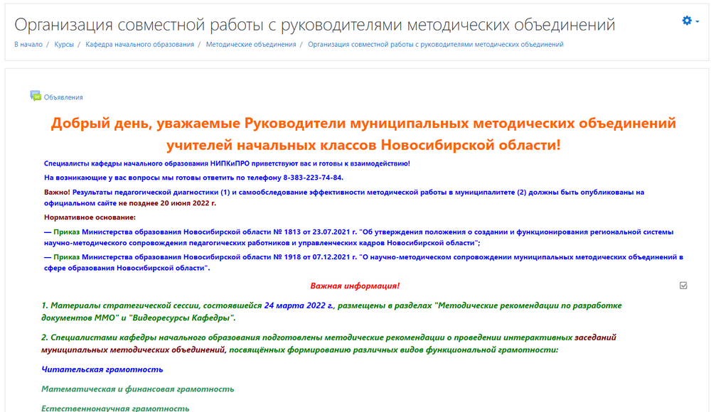 Для оперативного взаимодействия в системе дистанционного образования института создан ресурс для организации взаимодействия специалистов кафедры с руководителями ММО учителей начальных классов Новосибирской области. Там размещается вся оперативная информация, объявления, полезные ссылки, в том числе и на электронные образовательные ресурсы по теме «Формирование функциональной грамотности младших школьников».